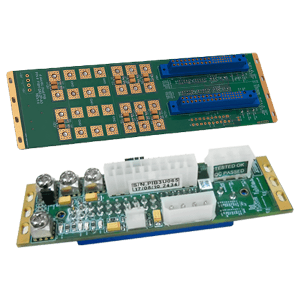 The Power Interface Boards are separate boards for the power section of the backplane. They are used to facilitate pluggable power supplies, headers, and utility connectors.